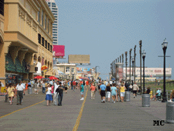 Atlantic City, NJ is right on the Atlantic Ocean, and has gently sloping sand beaches that go right down to the waters edge. Along these sand beaches is the famous boardwalk. Atlantic City was the first to have a boardwalk; the boardwalk being the solution chosen to reduce the amount of sand tracked into hotel lobbies by the hotel guests. The first boardwalk, built in 1870, was only 8 feet wide and was built in 12 foot sections, so that it could be taken up during the winter months, and stored. The present-day boardwalk is 60 feet wide and a little more than 4 miles in length. The boardwalk extends another one and one half miles into Ventnor City, making it the longest boardwalk in the world.